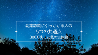 副業の失敗談 副業詐欺に引っかかる人の共通点5つ|300万円失った私が気づいたこと 副業で300万円以上を失った私が、詐欺に引っかかる人の共通点を正直に公開。契約前の“調べたつもり”が最大の落とし穴でした。 2026.03.03 副業の失敗談